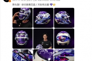 周冠宇今日在社媒晒出新队服,并写道:“新头盔!依旧是青花瓷 / 天际线主题 💜 ”