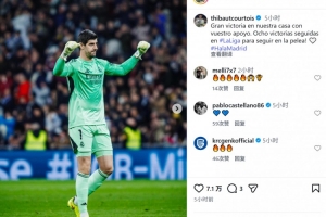 库尔图瓦社媒写道:“在主场取得重要胜利,感谢你们的支持。西甲8连胜,让我们继续为冠军而战!”