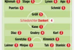拜仁vs不莱梅图片报评分:凯恩1分最高,迪亚斯、格雷茨卡、塔2分