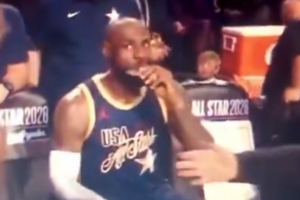 GIF-老詹没看到库里击掌,坐下后偷瞄一下~