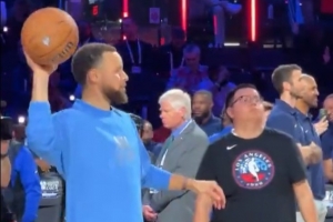 勇士球星库里因伤高挂免战牌,但他没有闲着,在赛前热身环节帮队友传球,十分敬业。