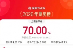 体育资讯02月21日讯 据央视新闻,网络平台数据,截至2月21日20时30分,2026年年度电影总票房(含预售)突破70亿!