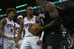 体育资讯2月23日讯 BA常规赛,76人135-108大胜森林狼,比赛中马克西快速突破左手隔扣了爱德华兹。