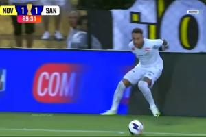 下半场第70分钟,桑托斯后场长传发动反击,34岁的内马尔奋起直追,结果仍然无法阻止球出边线,甚至还险些踉跄摔倒。