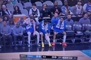 比赛期间,雷霆记者晒出替补席的“惨状”,就三名球员等待登场。