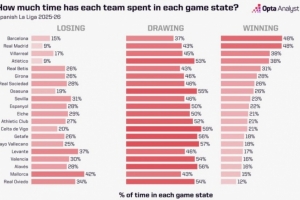 体育资讯2月27日讯 本赛季西甲25轮战罢巴萨以1分优势领先皇马居首,OPTA盘点了西甲各支球队本赛季在场上处于落后、平局以及领先形势的时间占比。