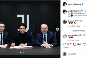 尤文官方宣布,麦肯尼与俱乐部续约至2030年。麦肯尼社媒晒出签署新合同的照片,配文:“再开心不过啦!又签了4年。”