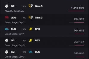 体育资讯3月22日讯 全球先锋赛G2半决赛横扫GEN,据Esports Charts统计,本场赛事收视率破百万,达到124万人次。
