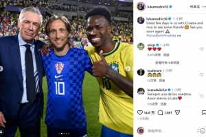 莫德里奇社媒晒出与安切洛蒂、维尼修斯、恩德里克、卡塞米罗的合照,配文:“与克罗地亚队一起在美国度过了很棒的几天,很高兴见到几位老朋友,期待很快再次相见!”