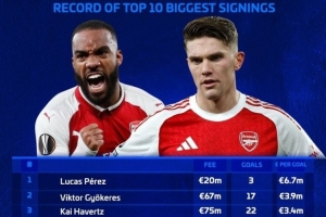 德转列阿森纳每进1球花费最贵前锋:佩雷斯670万,约克雷斯暂列第2