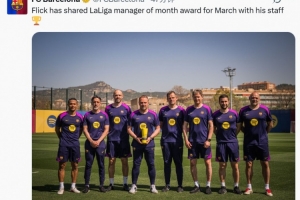 巴塞罗那在3月3场西甲保持全胜,主教练弗里克获得了西甲联赛颁发的三月最佳教练奖。弗里克一向重视教练团队的工作,他因此要求与自己最信任的团队成员一起领取这份荣誉。