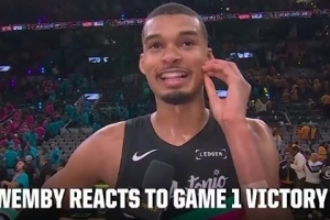 体育资讯4月20日讯 NBA季后赛首轮,马刺主场111比98击败开拓者,大比分1比0领先。赛后文班亚马在场边及发布会接受了采访,以下为采访全文。
