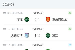 体育资讯04月25日讯 本赛季进入4月以来,浙江队连续5场中超比赛1平4负,且一球未进。