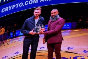 湖人主场迎战马刺,赛前东契奇领取了1月的月最佳球员奖杯。
